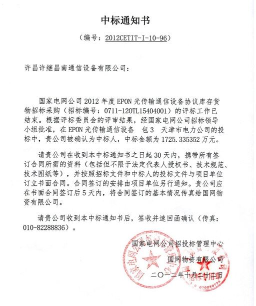 金秋十月傳捷報---EPON國網(wǎng)集招中標(biāo)
