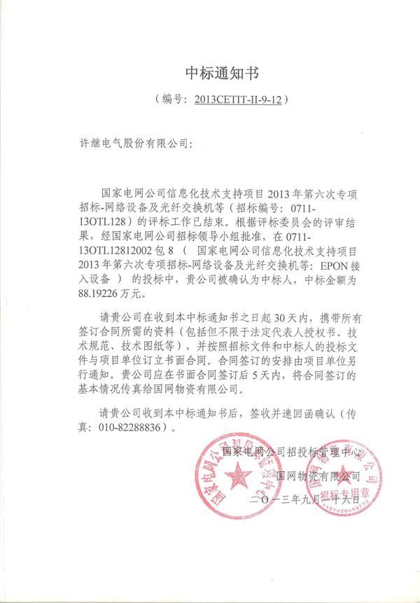 中標(biāo)國家電網(wǎng)公司信息化技術(shù)支持項目2013年第6次專項招標(biāo)江蘇、福建地區(qū)