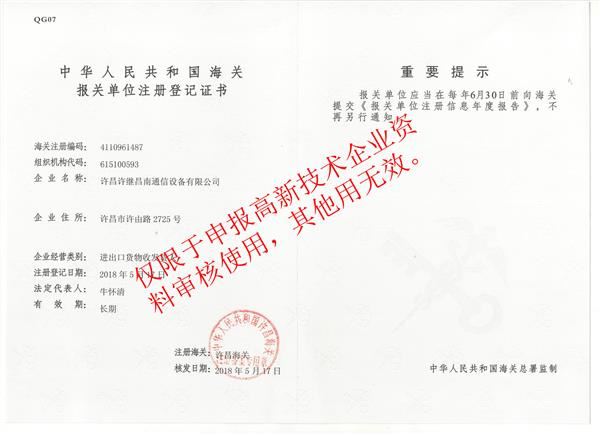 海關(guān)報(bào)關(guān)單位注冊(cè)登記證書